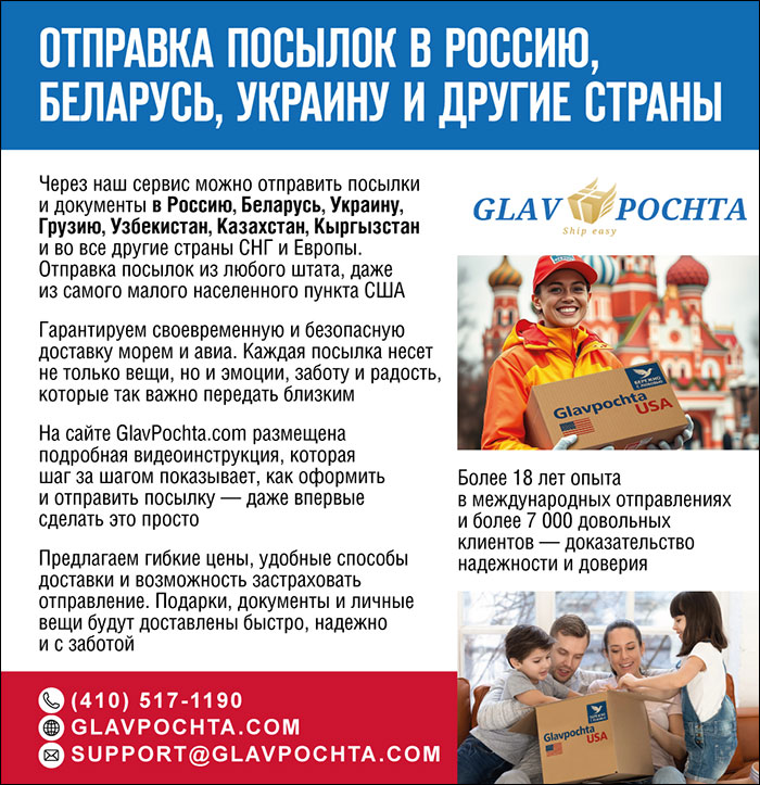 ОТПРАВКА ПОСЫЛОК В РОССИЮ, БЕЛАРУСЬ, УКРАИНУ И ДРУГИЕ СТРАНЫ Через наш сервис можно отправить посылки и документы в Россию, Беларусь, Украину, Грузию, Узбекистан, Казахстан, Кыргызстан и во все другие страны СНГ и Европы Гарантируем своевременную и безопасную доставку морем и авиа. Каждая посылка несёт не только вещи, но и эмоции, заботу и радость, которые так важно передать близким Более 18 лет опыта в международных отправлениях и более 7 000 довольных клиентов — доказательство надёжности и доверия На сайте GlavPochta.com размещена подробная видеоинструкция, которая шаг за шагом показывает, как оформить и отправить посылку — даже впервые сделать это просто Предлагаем гибкие цены, удобные способы доставки и возможность застраховать отправление. Подарки, документы и личные вещи будут доставлены быстро, надёжно и с заботой (410) 517-1190 |