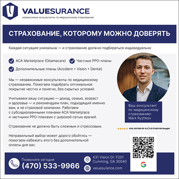 Страхование должно работать для человека, а не наоборот Valuesurance — независимое агентство медицинского страхования в Джорджии Планы Obamacare Русскоговорящий агент — Марк Рыжков Наш номер: 470-533-9966 Медицинское страхование, которому можно доверять |